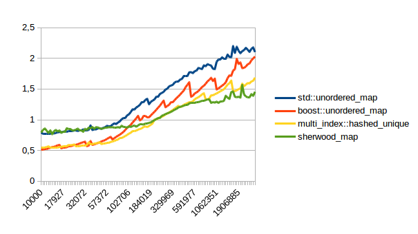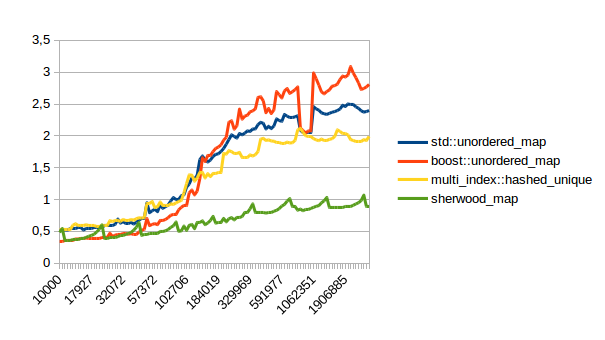 I was surprised though to see that sherwood_map also performs better in almost all other areas. Only when there are many modifications to the map is unordered_map faster. Note though that this is not the case if you modify values that are already stored in the map. Only when you erase objects and add new objects is unordered_map faster. (updating existing objects is as fast as performing a lookup)