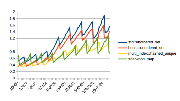 It would also suggest that my table above is not super representative of performance because I ran my tests with one million elements. The only reason I did that was that I needed to make the test long enough where you can measure an actual difference. It’s no good if the test takes 1ms for unordered_map and 1ms for sherwood_map.