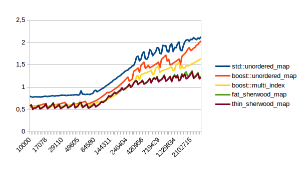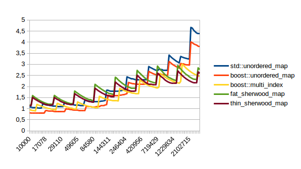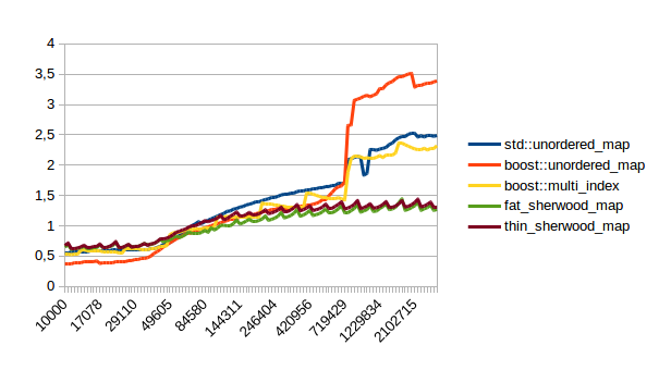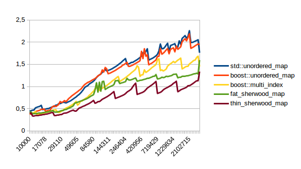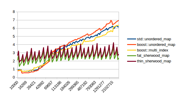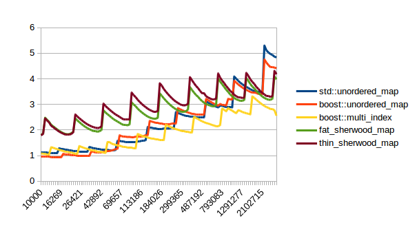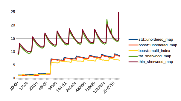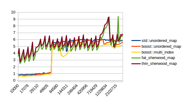 For the other graphs you get spikes whenever the load factor is too high: At those spikes the load_factor() approaches 0.85, which is my max_load_factor(). And at high load factors you get more bucket conflicts which means you have to check more elements and your branch predictor gets messed up. The branch predictor is the reason why successful lookups has bigger spikes than unsuccessful lookups. When you step through that code one lookup has to check only one element and immediately finds a match, then the next lookup has to check five elements and element number four matches, then you only have to check two elements and the first one matches. It’s difficult to predict. When you grow the map again it picks the next prime number for its capacity and the load_factor is lower again and most lookups only have to look at one element.