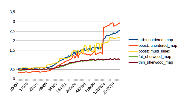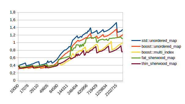 I’ve spent some time optimizing my sherwood_map implementation and now it is faster than boost::unordered_map and boost::multi_index. Which is what I would have expected from my first implementation, but it turns out that those containers are pretty damn fast.