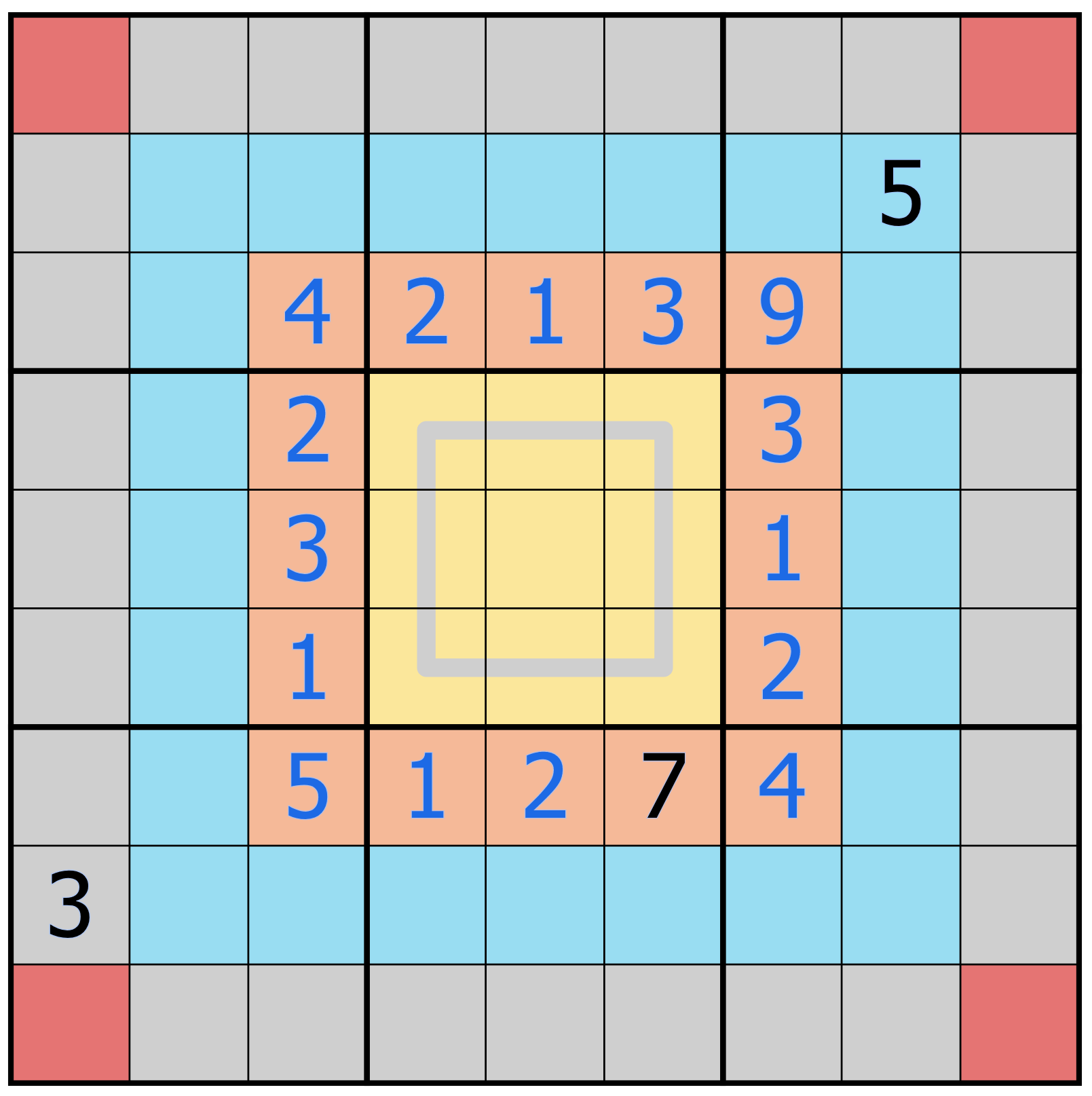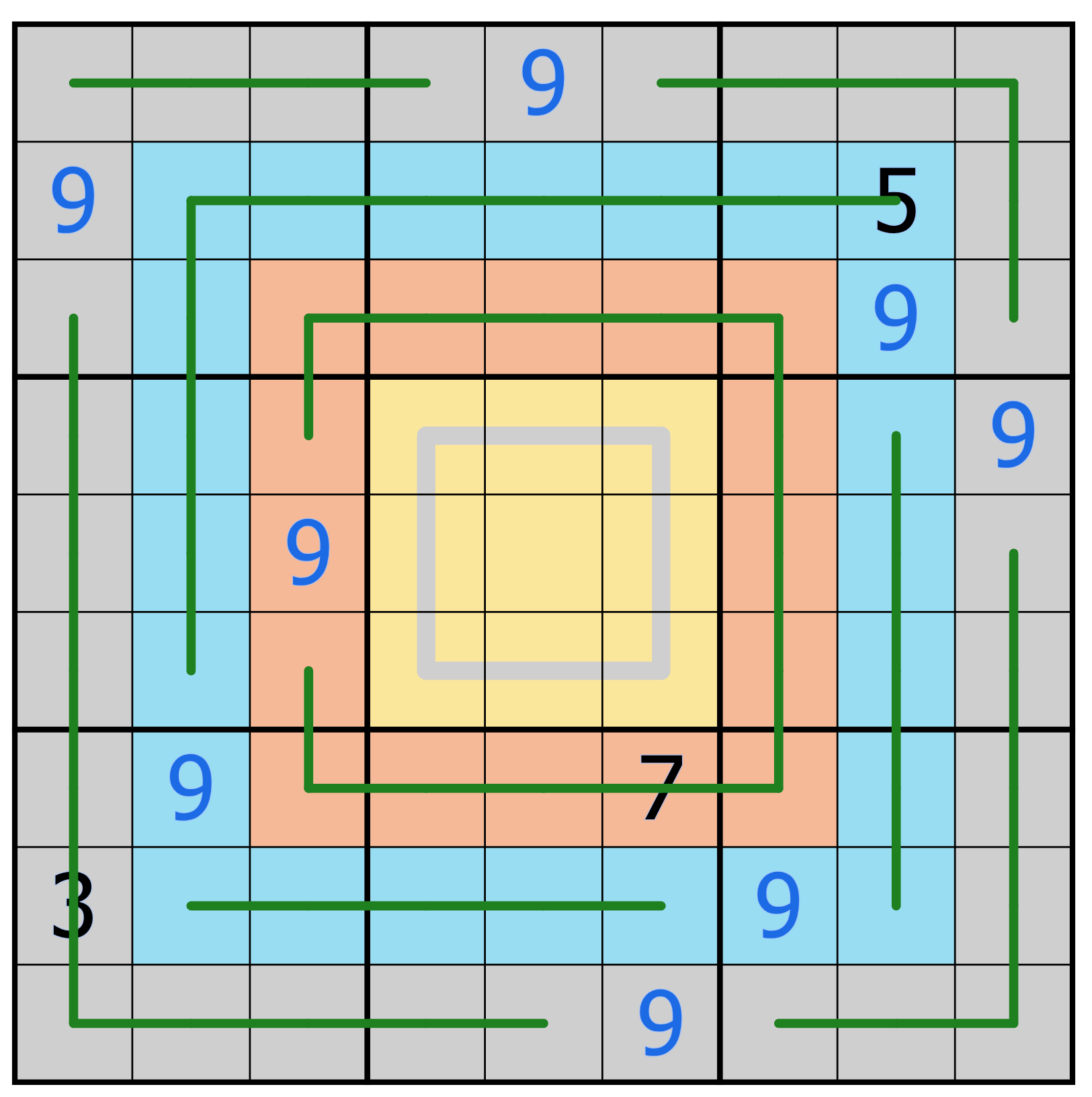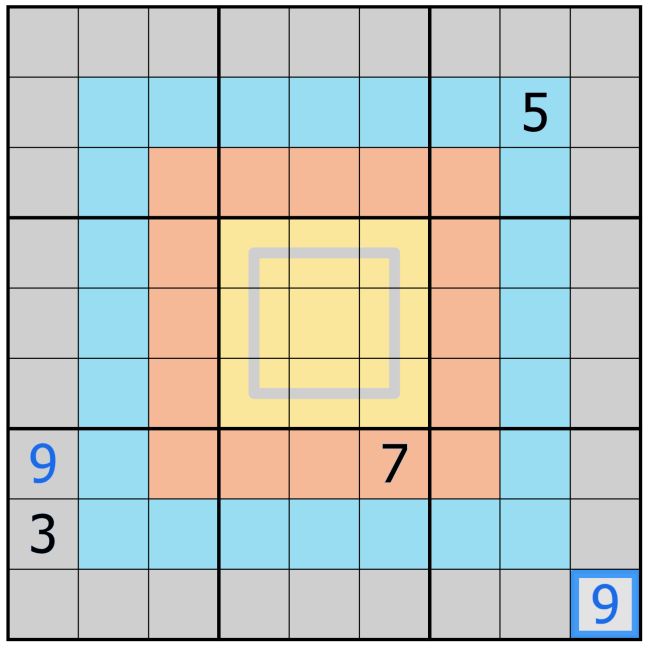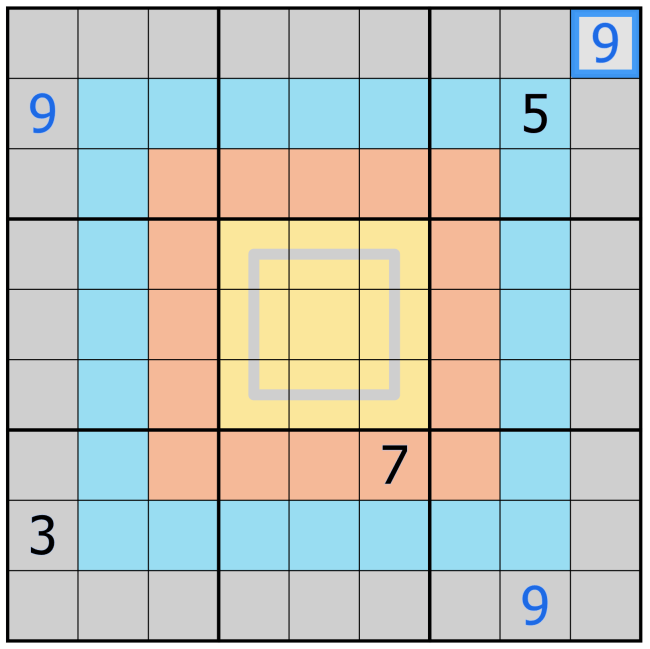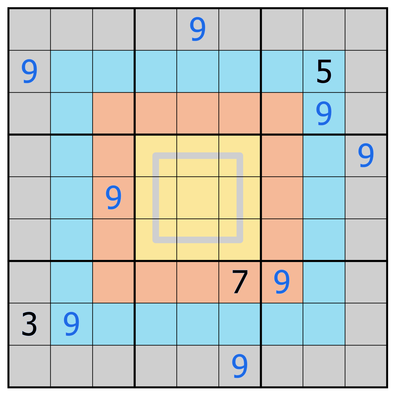 So how do we solve this? We have too few given digits so the extra rules must be helpful somehow. If you play around with this a little, you’ll find that the extra rule for the middle ring is useless at first. So lets investigate the 9s. I started off by just randomly placing them to get a feeling for how this behaves: