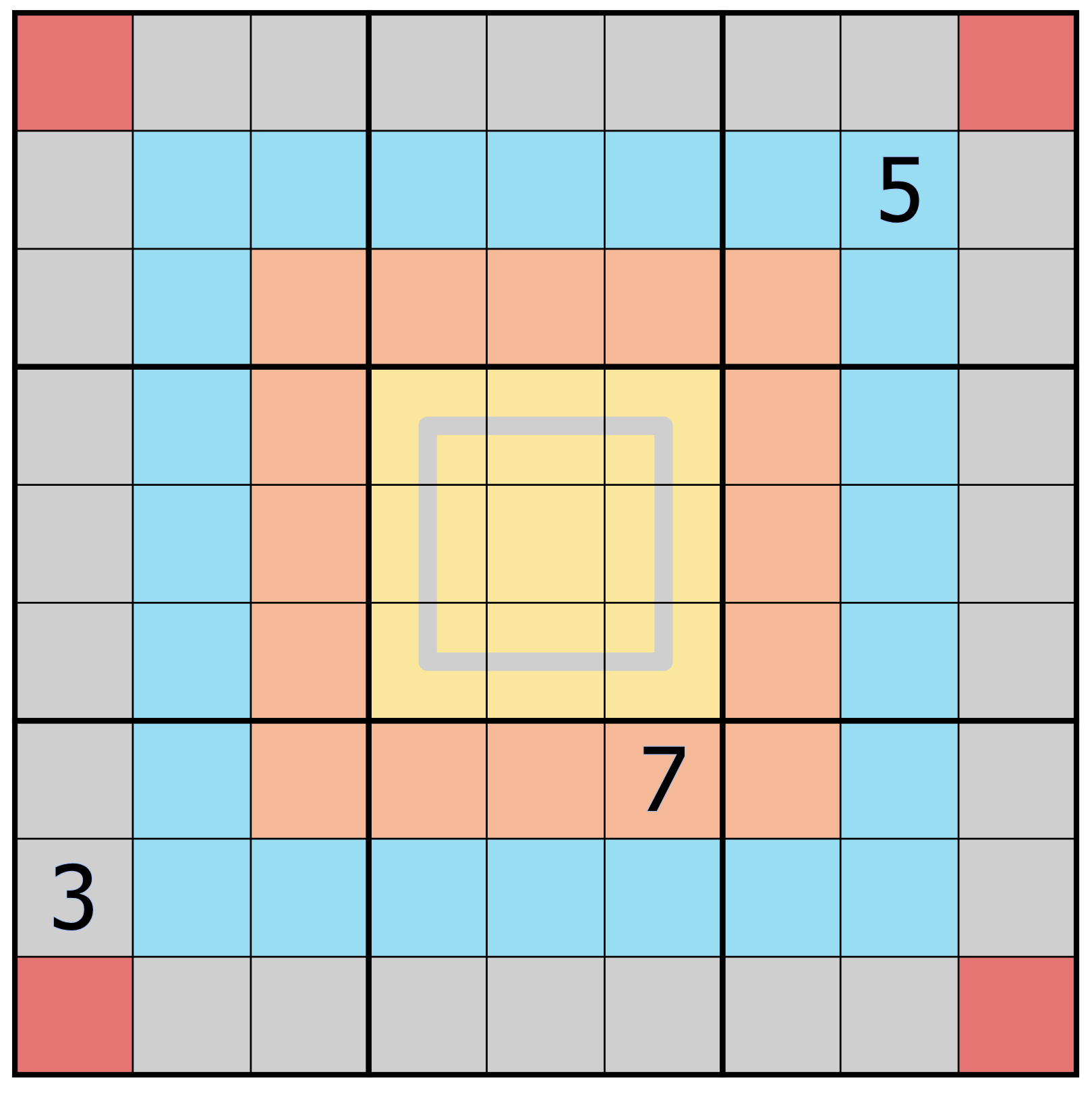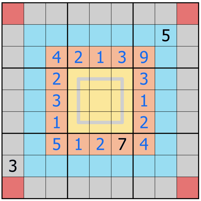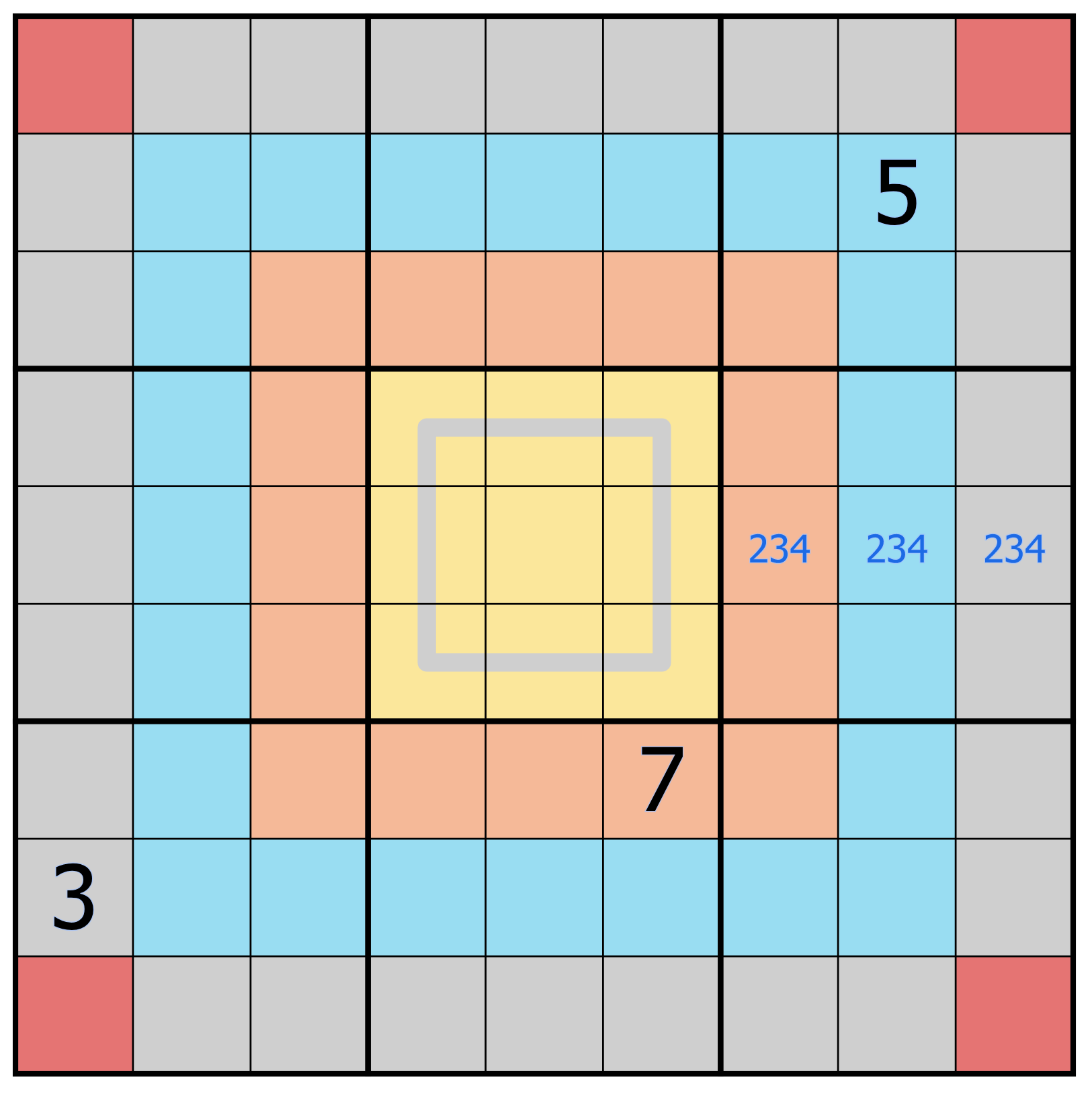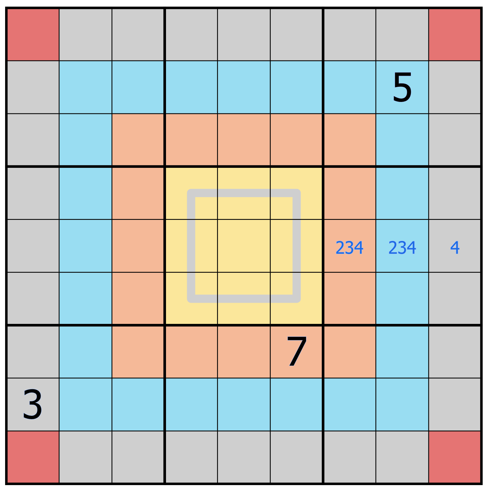 So how do we solve this? We have too few given digits so the extra rules must be helpful somehow. If you play around with this a little, you’ll find that the extra rule for the middle ring is useless at first. So lets investigate the 9s. I started off by just randomly placing them to get a feeling for how this behaves: