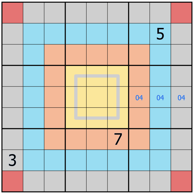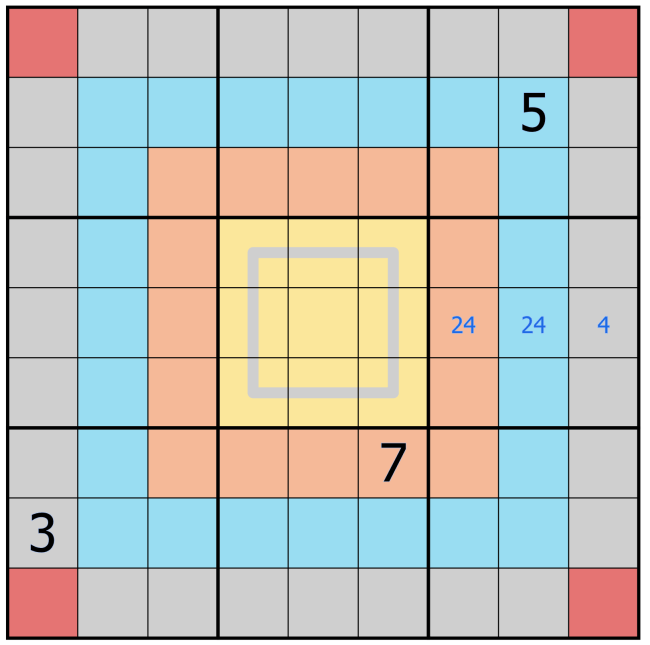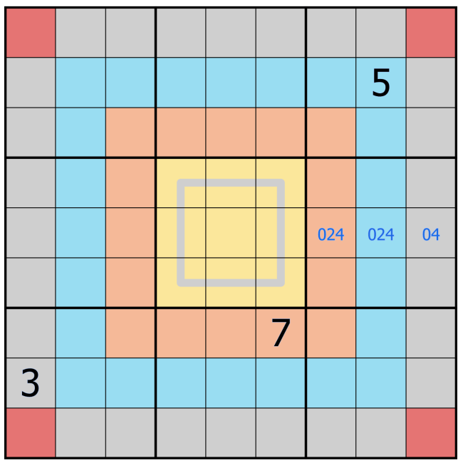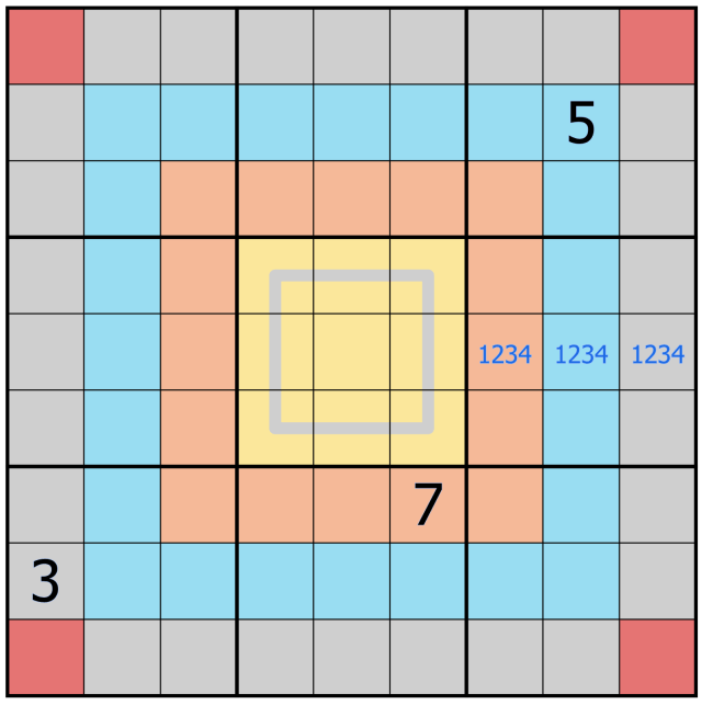 The 9 in the top right forces the other two 9s around the corner. This leaves too big of a gap between those two 9s. We can’t make that add up to 36, it’s always going to be bigger. So we can rule out all four corners. Lets mark them red to indicate that there won’t be a 9 in there: