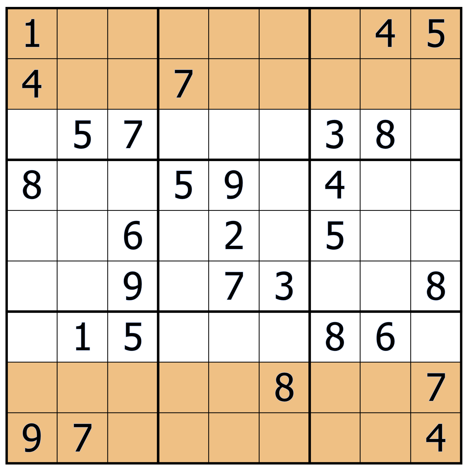 These are 36 digits consisting of the numbers from 1 to 9, four times each. This is just given by the rules of Sudoku. Now lets instead highlight column 3, column 6, box 2 and box 8:
