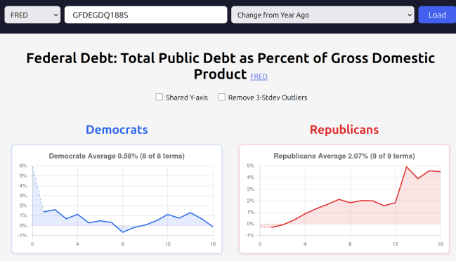I tried picking some honest series as examples. E.g. I picked the budget surplus/deficit series because it reflects decisions that people made intentionally. You could argue that the number that really matters is “debt as percent of GDP” and specifically how much that changes each year. That number looks great for democrats. But the reason it looks good for Biden is that inflation was high, so it’s unintentionally good. You don’t want to vote based on that.