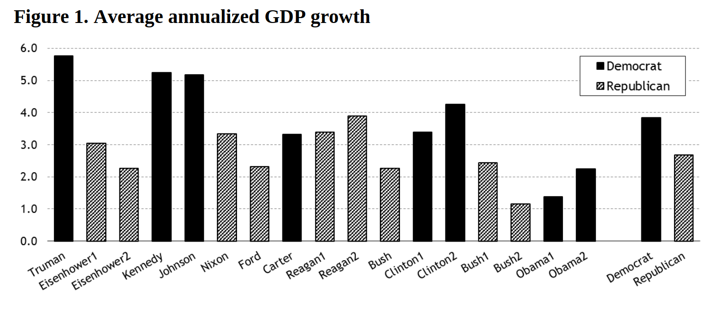Anyone who knows a little econometrics knows that the problem is identification. How do you identify what policies from Presidents of each party are responsible for growth, or lack thereof? Turns out, that is kind of hard. Presidents (and Congresses) do lots of things and figuring out their connection to growth isn’t easy. That’s why there’s debates about the size of fiscal multipliers.